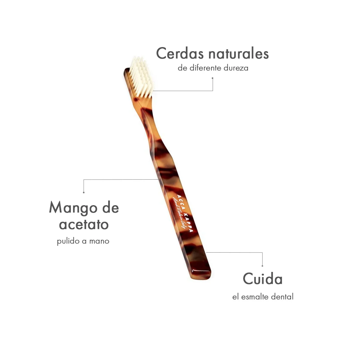 Cada cepillo de dientes está cortado a mano, fresado y moldeado a mano, a partir de acetato, luego se infunde con paquetes de cerdas blancas puras. Las puntas de cada mechón están redondeadas para proteger el esmalte dental, maximizar la eficiencia de limpieza y masajear suavemente las encías.