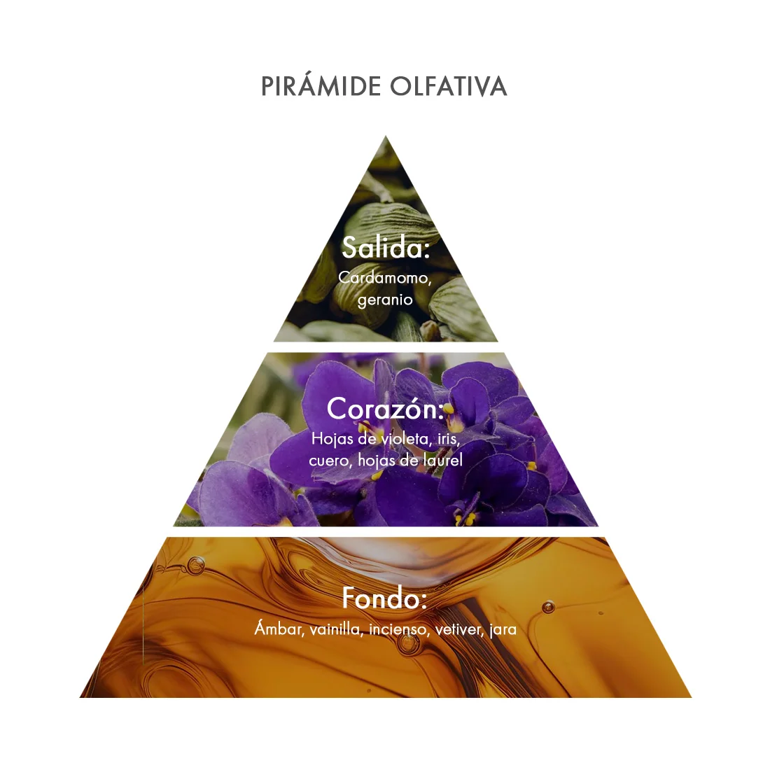 En torno a un refinado acorde del que nace un perfume viril, elegante y sofisticado. La vibración de la hoja de Violeta y la profundidad del Iris le aportan dinamismo y carácter. En su base, nos encontramos con la sensualidad innata del Ambar y de la Vainilla, que hacen de este Eau de Parfum un clásico atemporal masculino.