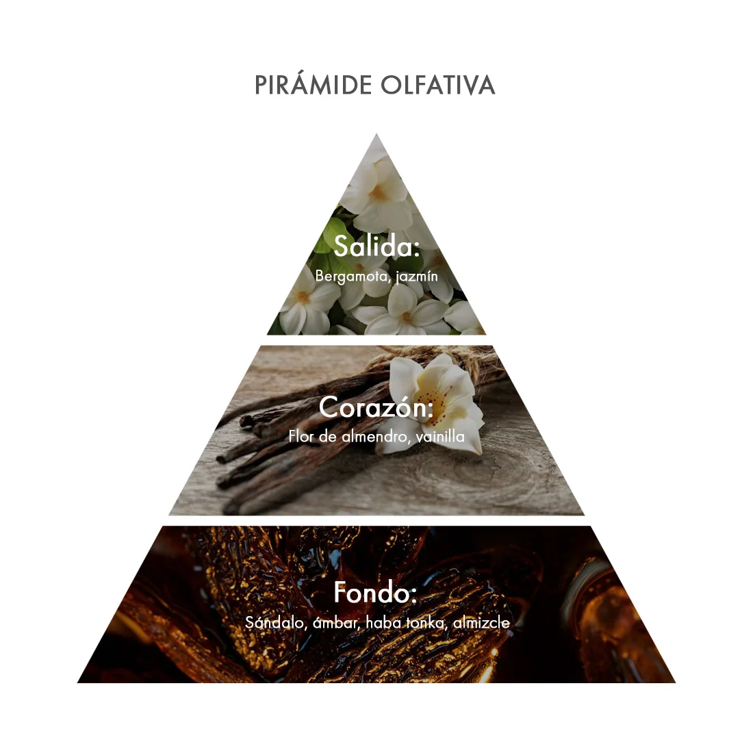 | Pirámide olfativa | Notas de salida: Bergamota italiana – Jazmín Notas de corazón: Flor de almendro – Vainilla Notas de fondo: Sándalo – Ámbar – Haba tonka – Almizcle |