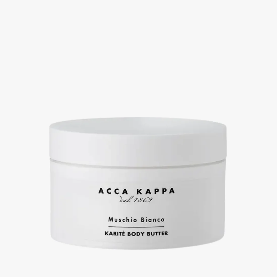 Mantequilla corporal Muschio Bianco de Acca Kappa: nutrición intensa con karité, jojoba y almendra. Piel suave, elástica y delicadamente perfumada.