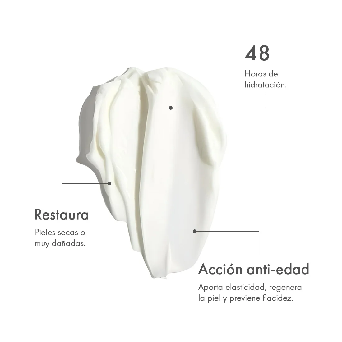 Un complejo con 30% extractos naturales en su fórmula como: aceite de semilla de uva, jojoba, coco, Argán, vitamina E y manteca de Karité que nutren e hidratan y gracias a sus antioxidante previenen los signos de la edad, ideal para hidratar y regenerar la piel.